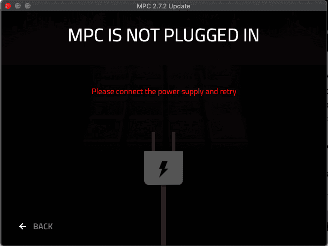 After restarting the MPC, I tried clicking the update button in the software on my computer again. No detect. A quick unplug-and-plug-back-in did the trick, but this time the software asked me to connect the MPC live to a power source (did I mention I was using the MPC in battery mode, and it still had 39% despite not being fully charged -- or used -- in several months?).